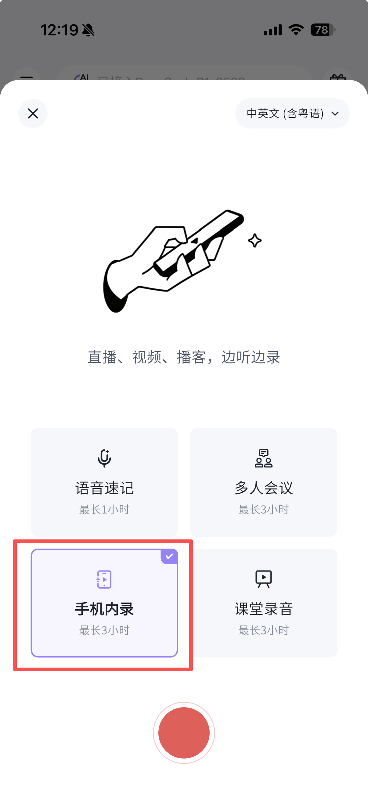 - 打开 APP,点击首页底部「录音」按钮,选择「手机内录」